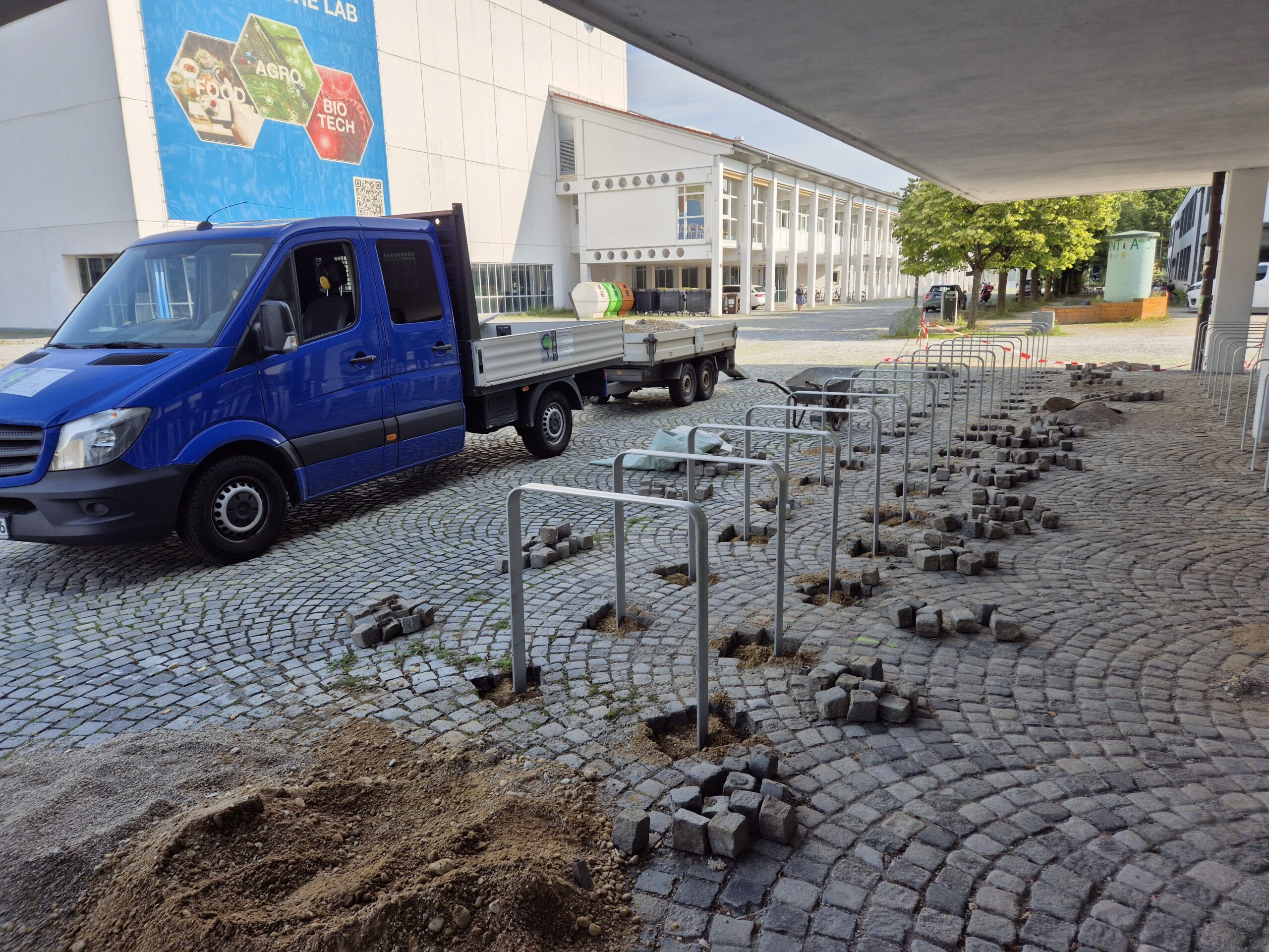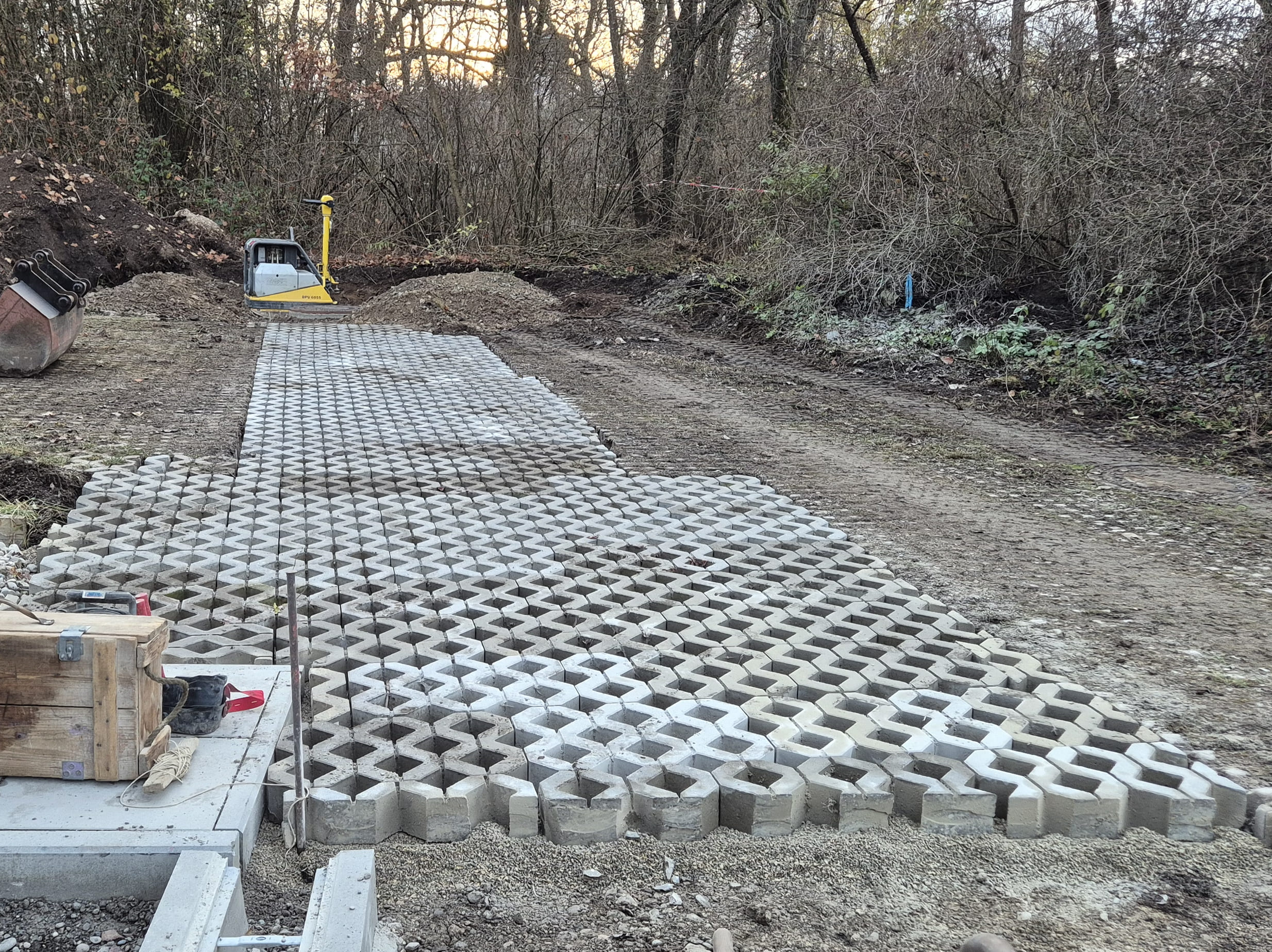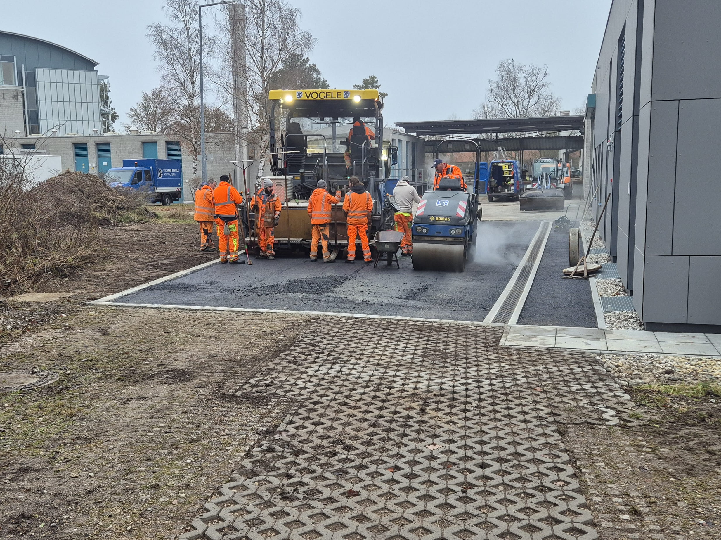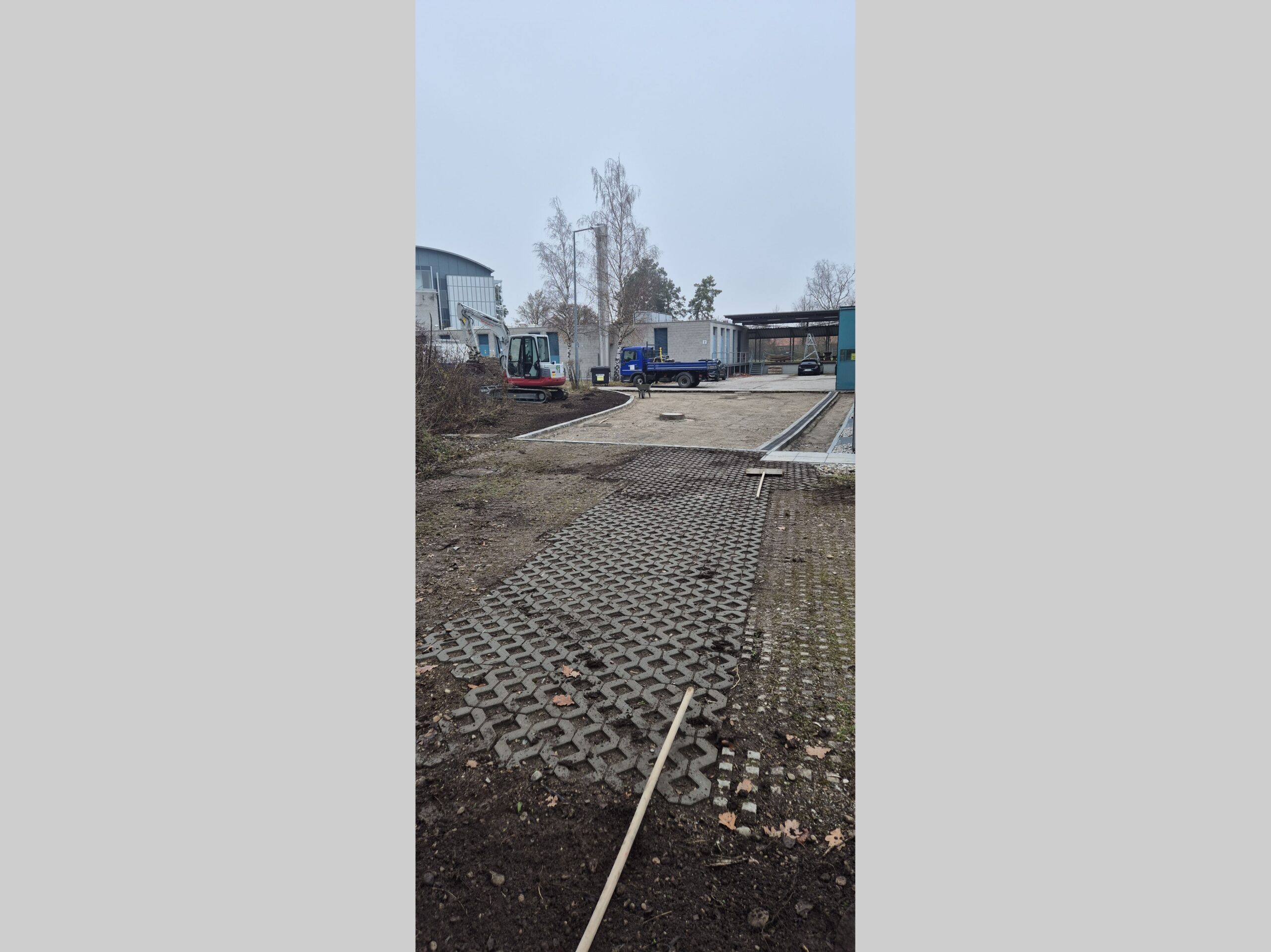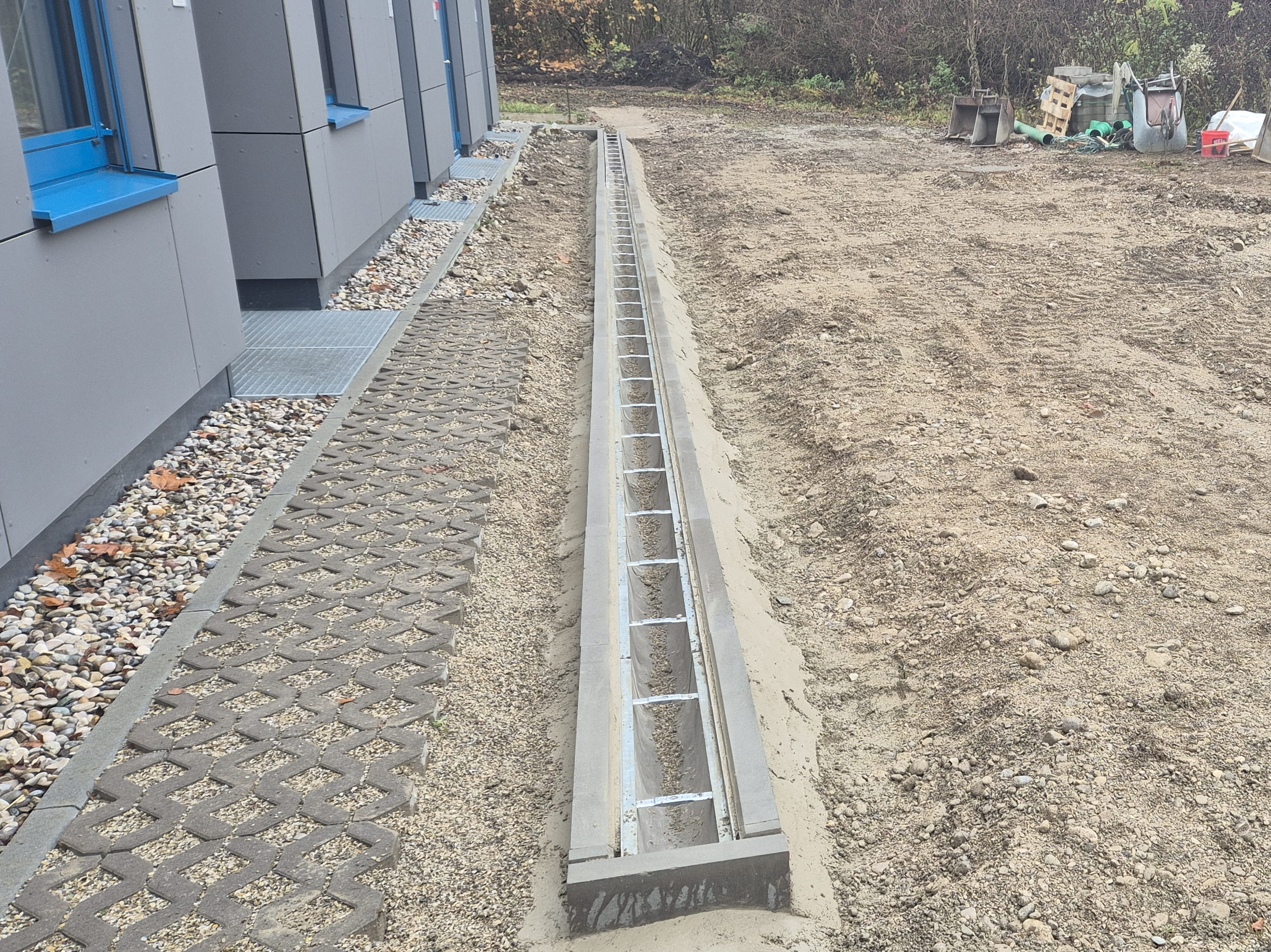Kaserne Garching Hochbrück: Aussenanlage um ein neues Gebäude mit Entwässerung, Einfassungen, Rasenfugenpflaster, Asphaltfläche